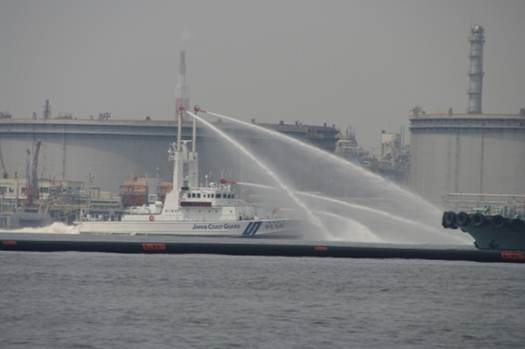 石油コンビナート・海上合同防災訓練において、海上に流れ出た油を拡散処理するため放水している「巡視艇あおたき」
