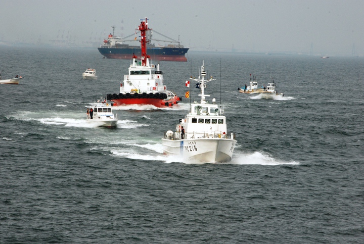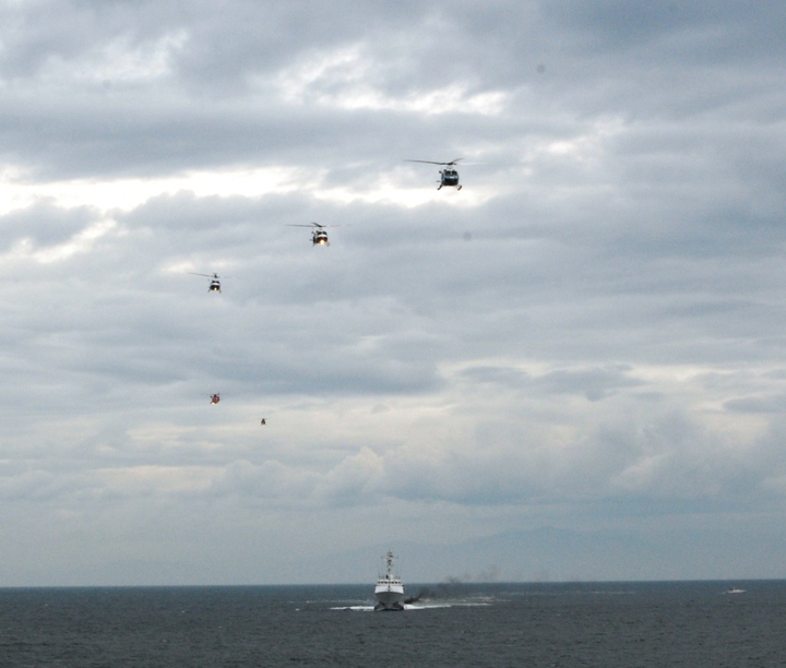 高速で約70メートルの距離まで巡視船みずほに接近し、一斉回頭する「あおたき」、「あゆづき」、「MH756 いせたか」