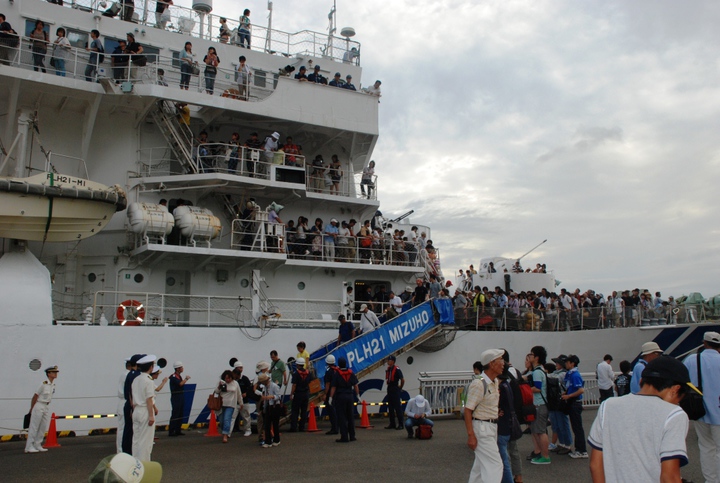 各行政機関等関係者、海上保安友の会会員及び事前に応募していただいた約5800人の中から、抽選で選ばれた一般市民約1400人が、巡視船みずほに乗船し、午後1時に名古屋港ガーデンふ頭を出港しました。