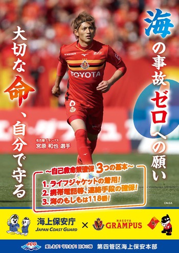 ~海の事故ゼロを目指して~名古屋グランパスと初コラボ!! 第四管区海上保安本部では、海の事故ゼロを目指した取組みの一環として、サッカーJ1リーグに所属する名古屋グランパスと初めてコラボさせていただくこととなりました。 名古屋グランパスのご協力のもと、啓発ポスターを作製し、 『 宮原 和也選...
