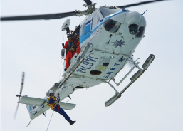 ヘリコプターから降下する潜水士