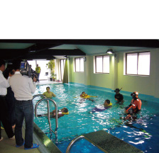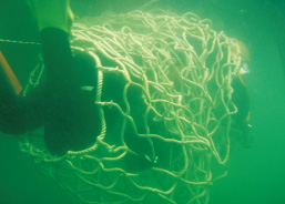 魚網に見立てた網の中に進入する潜水士