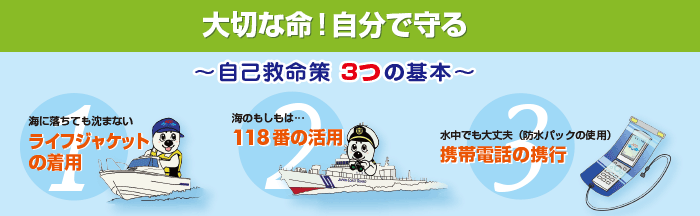 あなたが、もし、海に落ちたらどうしますか?岸から遠く離れた海上はもちろんのこと海岸付近でも、長い間浮いていることは難しく、また、誰も気づいてくれない可能性があります。そこで、第四管区海上保安本部では、海難事故に遭遇したあなた自身が、一刻も早く巡視船艇や航空機により救助され、生還を果たすために、次の「自己救命策3つの基本」の普及、推進に力を入れています。