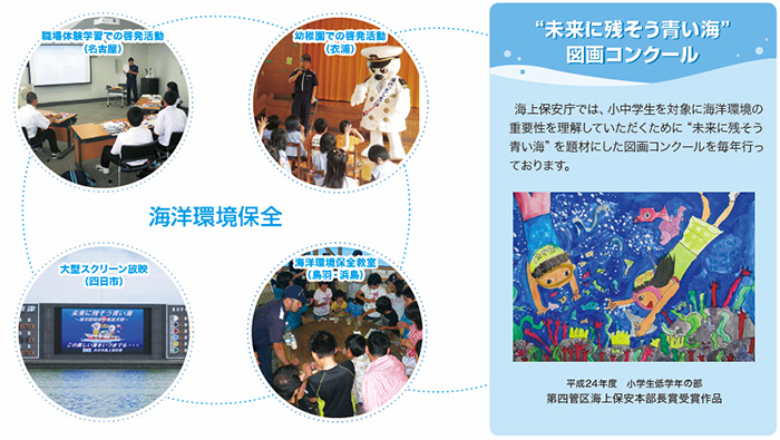 第四管区海上保安本部では、海洋環境保全思想の普及、海洋汚染防止関係法令の遵守を図ることで、海洋汚染を未然に防止し、海洋環境の保全のために「未来に残そう青い海」のスローガンのもと、海洋汚染状況
