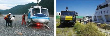 大規模な自然災害が発生した場合には、海上だけではなく、陸上においても、地方公共団体など関係機関と密接な連携のもと、被災者の救出、人員・救援物資の緊急輸送などの災害応急活動を行います。