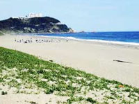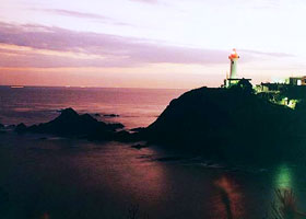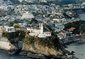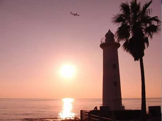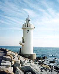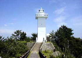 渥美半島は、知多半島とともに三河湾を形成しており、最先端の古山が海に落ち込む波打ちぎわに白亜の灯台が立っています。 渥美半島沖にある伊良湖水道は潮流が速く、暗礁が沖まで続いている航海の難所であったため、当時の逓信省灯台局により建設され、昭和4年11月20日初点灯し、現在も伊勢湾口部の重要な初認標識として役割をはたしています。 田原市では、伊良湖岬を一周できるよう遊歩道を整備しており、この灯台を間近で見ることができ、同時に正面に三角形の神島も見ることができます。 近傍には、波の浸食で出来た洞窟のある沖の石門と、それに対して波打ち際にある岸の石門との「日出(ひい)の石門)」があり、この上の断崖には島崎藤村の"名も知らぬ遠き島より流れよる椰子の実一つ・・・・・"の詩としても有名な「椰子の実」の記念碑が建っています。