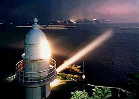 明治41年7月伊良湖水道での軍艦の事故を端緒に、軍事上の要請と名古屋、四日市港の貿易振興上から航路標識の設置について建議されるようになり、明治42年に灯台の建設が始まり、明治43年5月1日に点灯しました。 当時は、石油ランプが灯台光源の主力でしたが、この灯台は日本で最初の白熱電球を使用した電気式灯台で、7千カンデラの光を出したということです。 また、同時に不動アーク灯の副灯を設けて「コズカミ」礁を照らしていました。なお、当時は鋼鉄製の灯台でしたか、昭和42年鉄筋コンクリート製に改築されています。