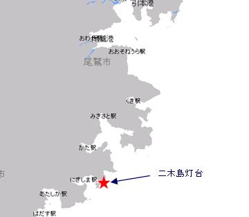 二木島灯台は、風光明媚な吉野熊野国立公園の特別保護地域である楯ヶ崎園地に位置しており、灯台のある海岸までは遊歩道も整備されており、三重県の名勝天然記念物に指定されている「楯ヶ崎」 が望めます。