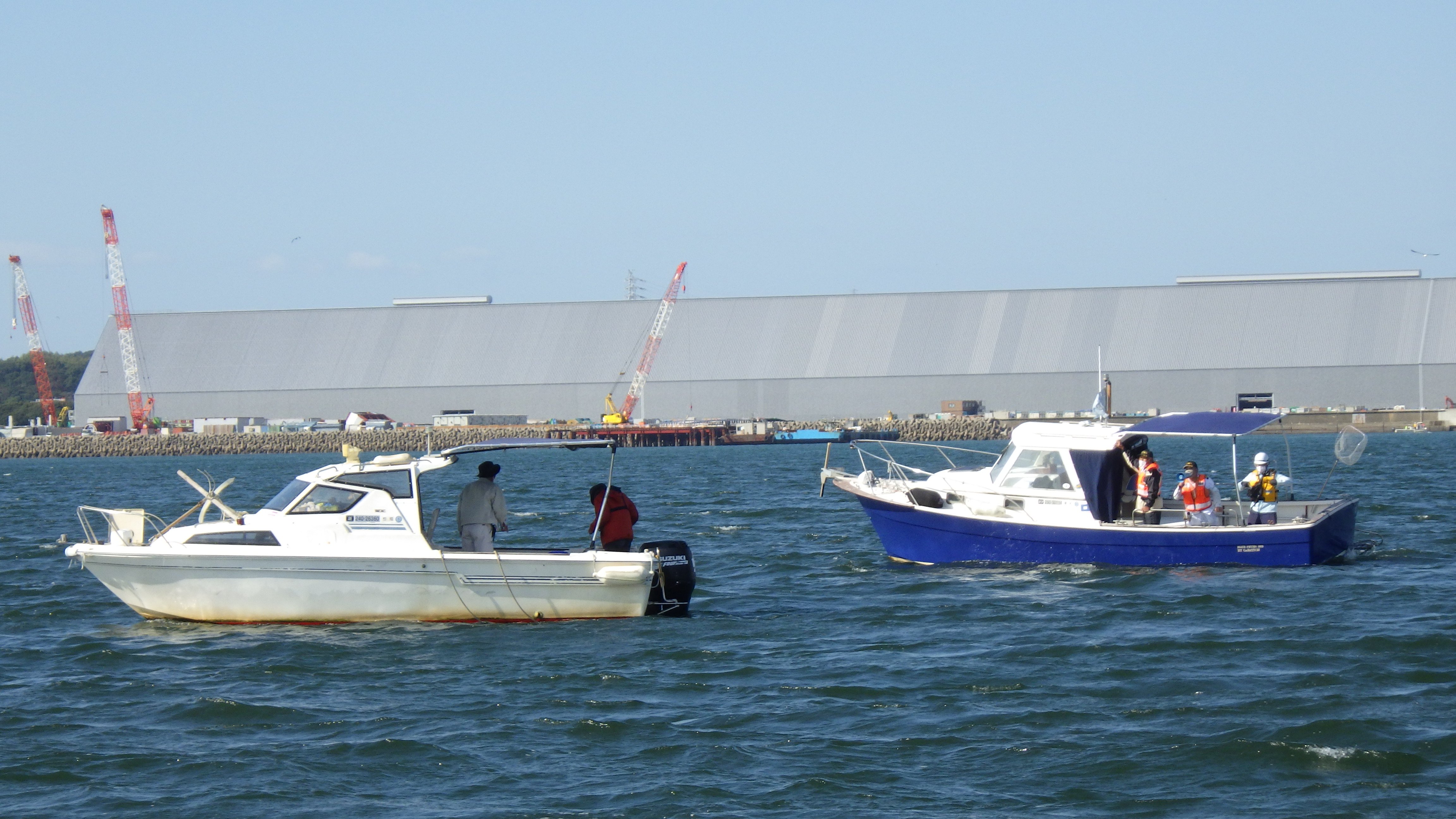 釣りをしているプレジャーボート船長にライフジャケットの着用を呼びかける海上安全指導員。