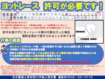特定港内において端艇競争その他の行事をしようとする者は予め港長の許可を受けなければなりません。(港則法第32条) 行事該当の有無について疑問がある場合には、三河海上保安署港務係にお問い合わせください。 リーフレットはこちら 【ヨ...