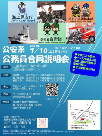 三重県四日市市で公安系公務員合同説明会を開催いたします。 参加機関は、海上保安庁のほか、自衛隊、四日市消防本部の三機関です! 日時:令和3年7月10日(土) 9時30分~12時00分(受付開始:9時00分) 場所:三重県四日市庁舎6階 三重県四日市市新正4-21-5 (近鉄新正...