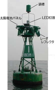 ・左舷標識・・標識の位置が航路の左側(水源に向かって)の端であることを示す。形状は、頭標が緑色円筒形1個、標体緑色。写真の灯浮標では、光り方が群閃緑光 毎6秒に2閃光となっています。 ・灯浮標・・船舶に岩礁や浅瀬、また、航路を示すために設置され、海上に浮かべられた標識。 写真の灯浮標では、光源は視認性が良く、高寿命で消費電力の小さいLEDを使用し、電力は100%自然エネルギーである太陽光発電によりまかなわれています。 海上にある灯標・灯浮標は非常に小さい反射物で、船舶のレーダで鮮明に捕らえることは難しいため、標識の捕そくを容易にするためにレーダレフレクタという金属製の反射体が設けられています。 |