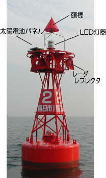 ・右舷標識・・標識の位置が航路の右側(水源に向かって)の端であることを示す。形状は、頭標が赤色円すい形1個、標体赤色。写真の灯浮標では、光り方が群閃赤光 毎6秒に2閃光となっています。 ・灯浮標・・船舶に岩礁や浅瀬、また、航路を示すために設置され、海上に浮かべられた標識。 写真の灯浮標では、光源は視認性が良く、高寿命で消費電力の小さいLEDを使用しています。電力は100%自然エネルギーである太陽光発電によりまかなわれています。 海上にある灯標・灯浮標は非常に小さい反射物で、船舶のレーダで鮮明に捕らえることは難しいため、標識の捕そくを容易にするためにレーダレフレクタという金属製の反射体が設けられています。 |