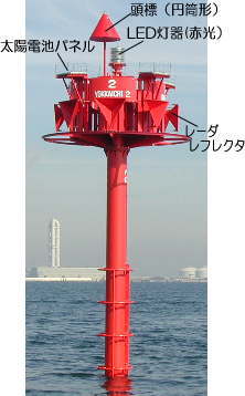 ・右舷標識・・標識の位置が航路の右側(水源に向かって)の端であることを示す。形状は、頭標が赤色円すい形1個、標体赤色。写真の灯標では、光り方が群閃赤光 毎6秒に2閃光となっています。 ・浮体式灯標・・船舶に岩礁や浅瀬、また、航路を示すために設置され、海上に設置された標識。円筒形の標体を直立させ海底の錘に連結したもの。灯浮標と比較し、海面での振れ回り、潮流、波浪による傾斜が少ないため高精度で位置を表示し、昼夜とも視認しやすい。 写真の灯標では、光源にLEDを使用し、電力は太陽光発電によりまかなわれています。 海上にある灯標・灯浮標は非常に小さい反射物で、船舶のレーダで鮮明に捕らえることは難しいため、標識の捕そくを容易にするためにレーダレフレクタという金属製の反射体が設けられています。 |