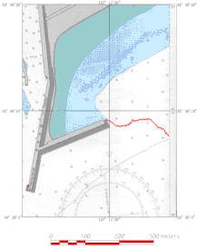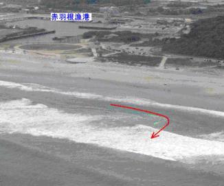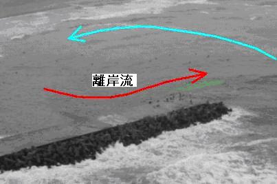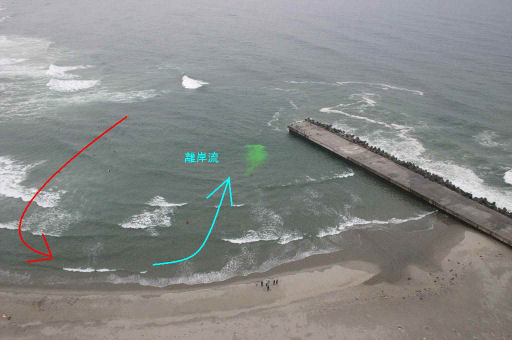 離岸流調査を平成18年7月6日及び14日の両日、愛知県田原市の赤羽根海岸で実施しました。 潜水士が流れた速さは、赤羽根漁港東防波堤の先端でおよそ1.2m/sでした。(14日) 写真は、シーマーカー(緑色)での調査を上空から撮影したものに、模式的に矢印(赤が離岸流、水色が向岸流)で流れを描画しています。 図は、ダイバー(海猿)の流れた軌跡を赤い線でなぞっています。(両日とも図の左から右に流れました。)
