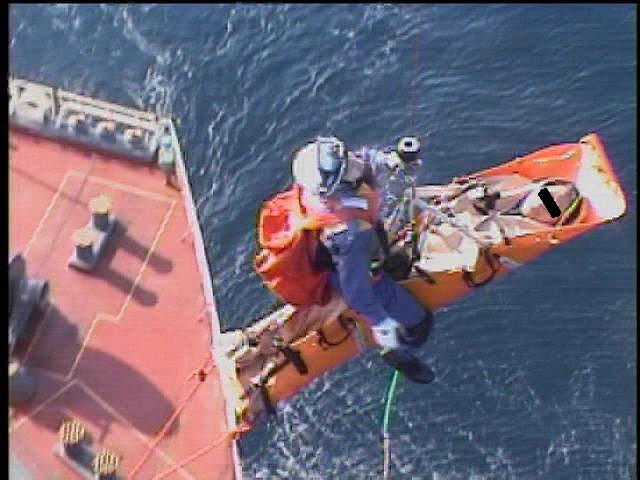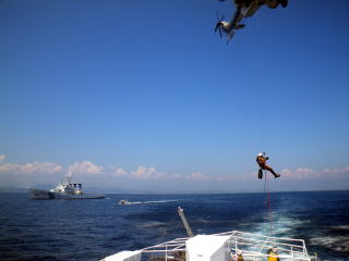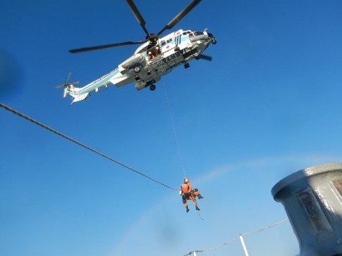 平成23年6月8日、潮岬沖を航行中の貨物船からの負傷者の吊り上げ救助を 実施しました。 |