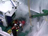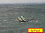 平成21年12月19日、艀(はしけ)2隻が、兵庫県東播磨沖で荒天により曳航ロープが切れ海苔網に乗揚げ、船での救助が困難であったため、乗組員2名の吊上げ救助を実施しました。 |