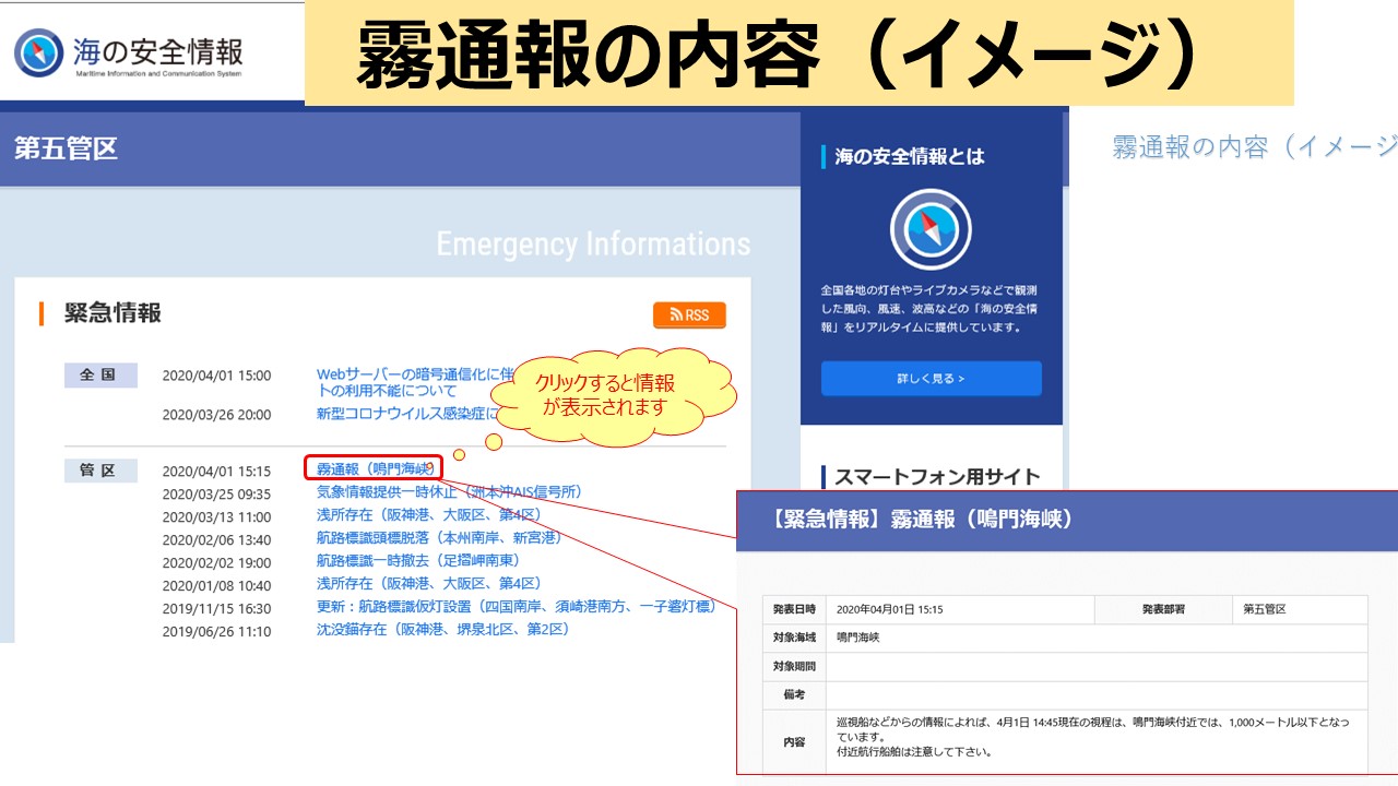 霧通報の提供内容は、海の安全情報(リンク先)の緊急情報サイトに視界が2,000メートル以下になった場合のみ情報を提供しています。 『霧通報(鳴門海峡)』の項目がある場合は、霧通報の情報を提供しています。 提供内容(例) |