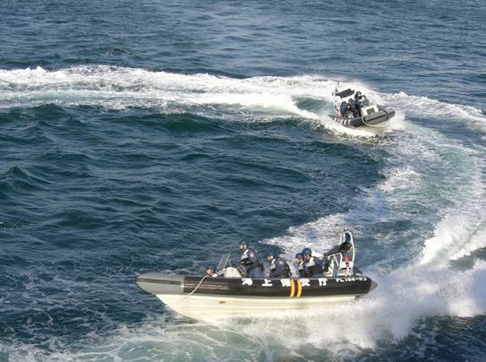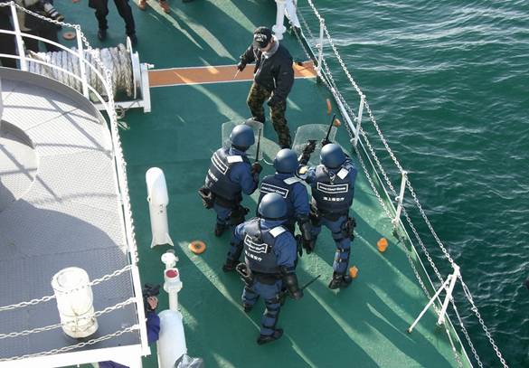 多くの報道陣や「海上保安友の会」和歌山支部等からの見学者が訪れた中、巡視船きい特警隊は、警棒や大楯の操法や、ゴムボートによる船体運動、さらには船上でナイフを振り回す暴漢を制圧する訓練を行いました。