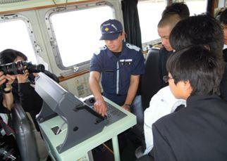 この職場体験学習では、巡視艇船内見学(船内の機器・エンジンの説明)、ロープの結び方の実習及び施設見学等行い、海上保安業務の一端を見聞することにより将来の進路決定に役立っています。