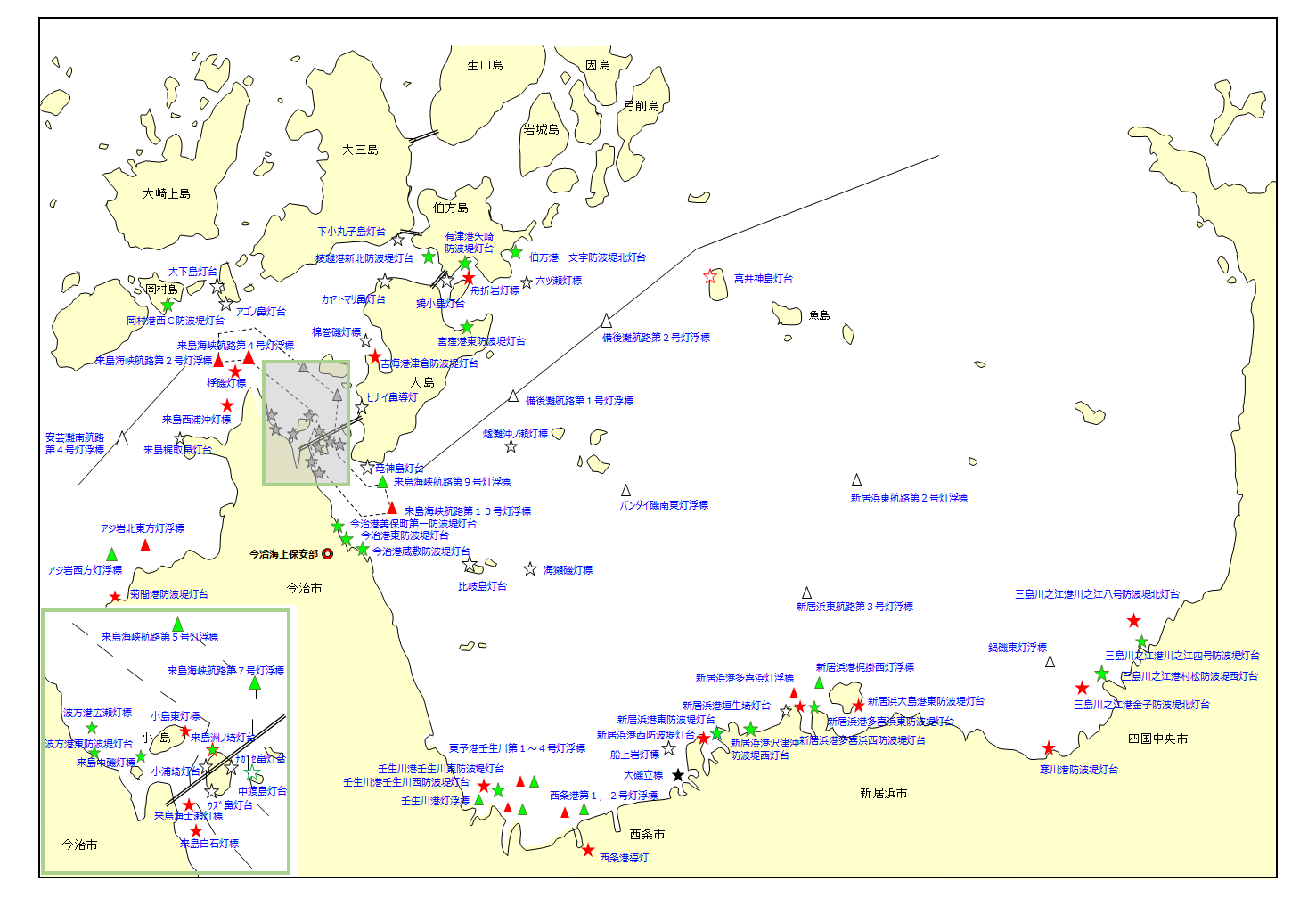 今治海上保安部が管理する航路標識は全部で81基あり、配置は以下のとおりです。