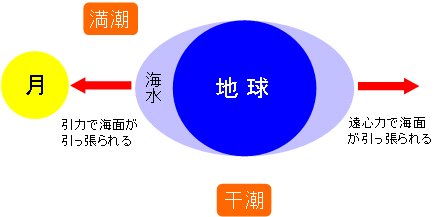「潮の満ち引き」は月と太陽の引力によって潮の干満が発生する状態のことで、新月や満月の前後数日間の干満の差が最も大きい時期が「大潮」で、月の形状が半月になる上弦や下弦の前後数日間の干満の差が小さい時期を「小潮」といいます。 |