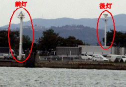 通航困難な水道、狭い湾口などの航路を示すために、航路の延長線上の陸地に設置した2基を一対とする構造物で光を発するもの |