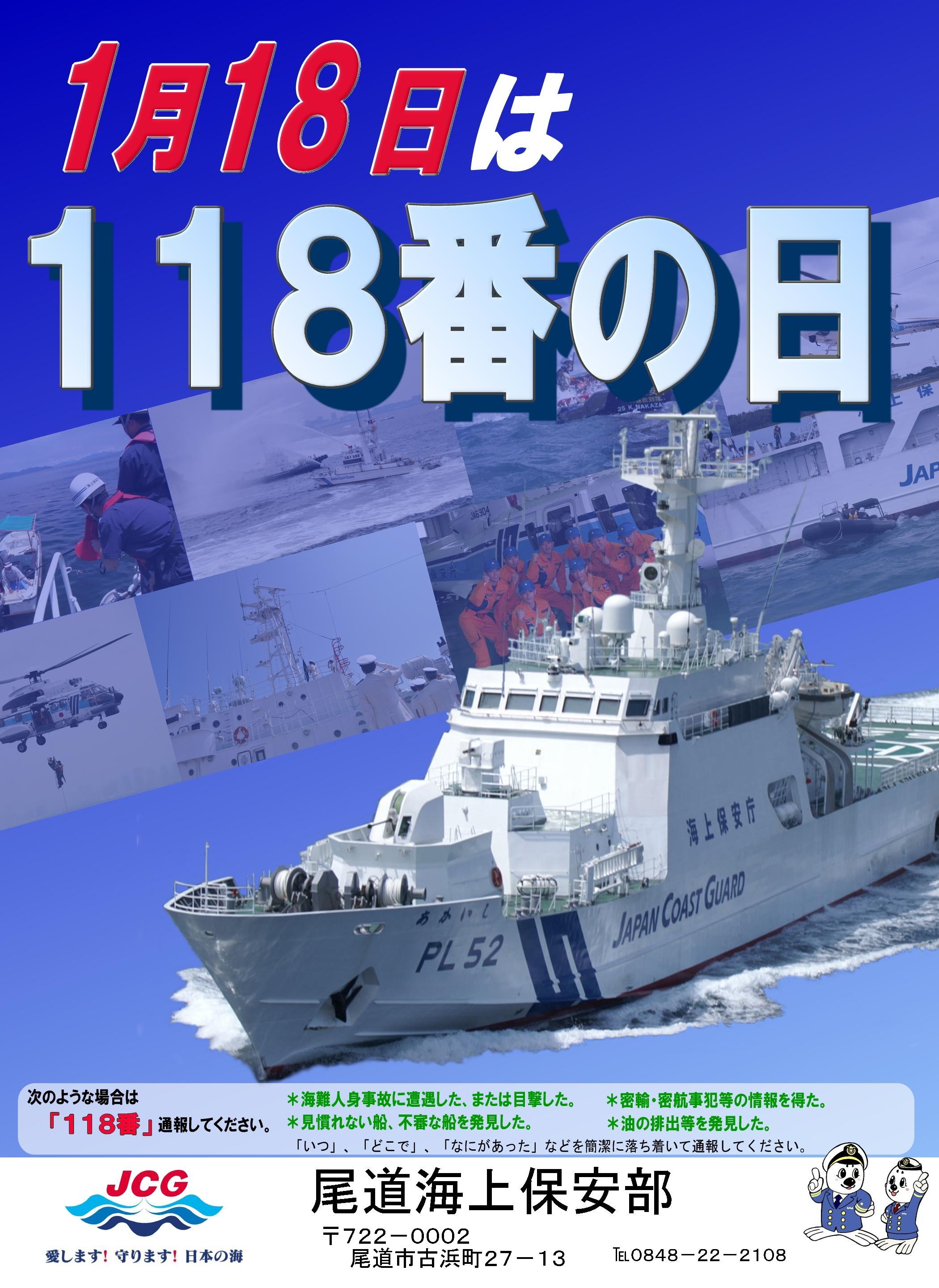 1 「118番の日」制定について 海上保安庁緊急通報用番号「118番」は、平成12年5月1日に運用を開始し、今年で10周年を迎えました。しかしながら、「118番」は、国民の皆様への周知は、未だ十分に浸透しているとは言えません。 そこで、海上保安庁では、「118番」の重要性をより多くの人々に理解していただくために、このたび、毎年1月18日を「118番の日」とすることといたしました。