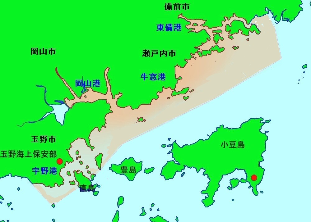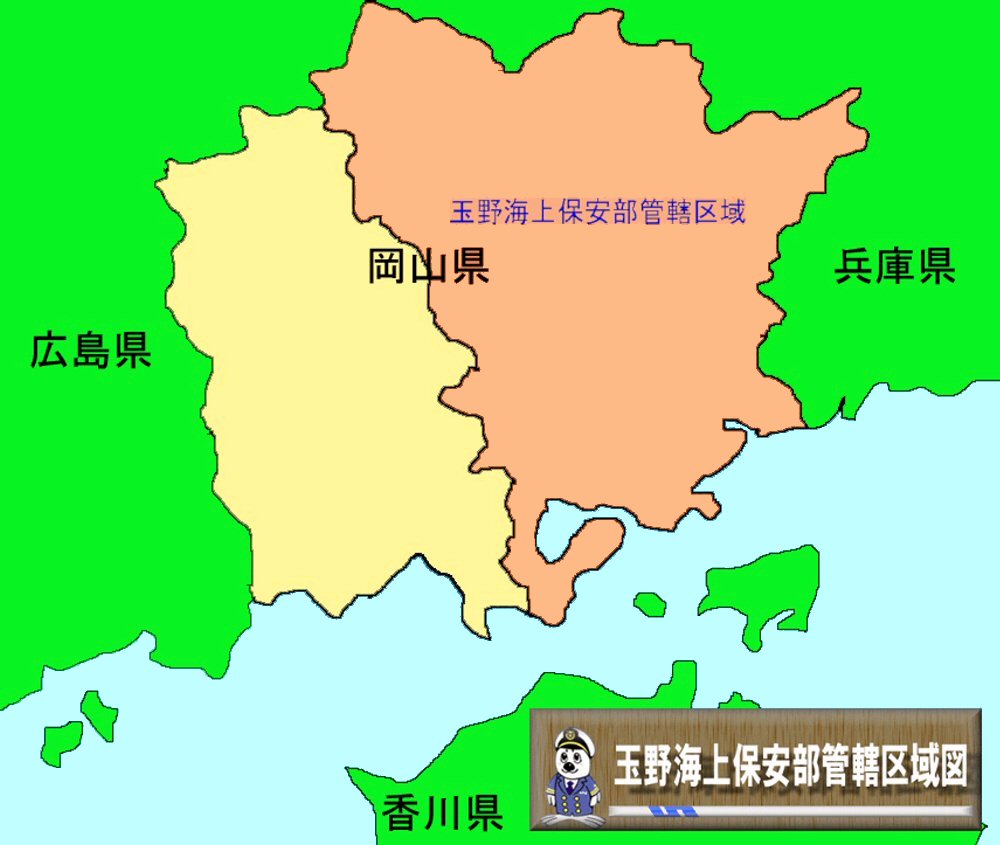 玉野海上保安部の担任海域は、岡山県の東部地区(玉野市、岡山市、瀬戸内市、備前市)の沿岸部と、香川県香川郡直島町等の香川県の一部の沿岸部を含む水域で、東西に細長く延びています。