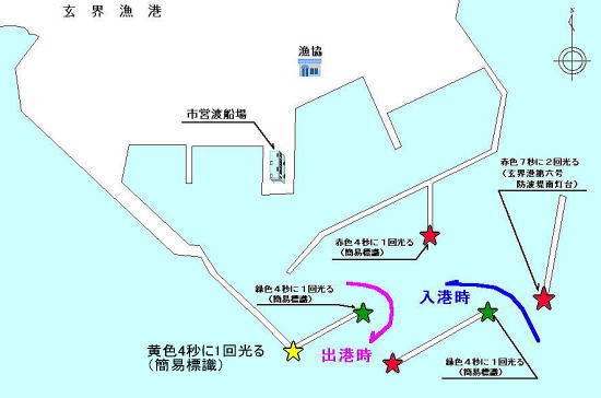 ○港への出入りは分離しており、入港時は港口正面右側、出港時は港口正面左側となっているので要注意。