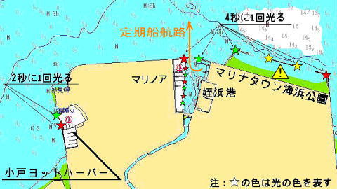 航行安全上の留意事項 ○福岡市海浜公園においては、条例により、指定船舶以外進入禁止となっています。違反者には過料(5万円以下)が科せられます。 ○姪浜港から定期船や漁船また、マリノアからプレジャーボートが出てくるので注意が必要。 ○小戸ヨットハーバー西側には、のり養殖施設(毎年10月から翌年4月)が設置されているので注意。 ○伊崎漁港からマリナタウン海浜公園沖にかけて養殖施設(毎年10月から翌年4月)及び広範囲に刺し網などが設置されているので注意。 |
