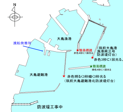 港湾要目 ○港湾種別:地方港湾、避難港、第2種 ○動力漁船: 191隻 (2006年福岡県水産林務部漁政課資料から) ○航行の支障となる港内工事 大島漁港内及び宮崎地区は、港内岸壁工事中 ○水域利用団体 宗像漁業協同組合大島支所 航行安全上の留意事項 ○入出港の際の注意事項 (避難港) ○神湊港との間に定期旅客船便及びカーフェリー便があり、発着場所は、避難港にある。 ○南西の風が吹くとうねりが入ってくる。 ○補給・・・清水、燃料油は少量であれば補給できる。 (漁 港) ○漁港内には内防波堤があり港口は狭い。 ○漁港防波堤(筑前大島港漁港南三号防波堤灯台)内には、いけすが設置されている。 ○大島地区と宮崎地区の間は、浅瀬があり、注意が必要。 |