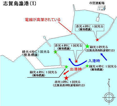 港湾要目 ○漁港種別:第2種 ○動力漁船: 120隻 (2006福岡県水産林業部漁港課資料から) ○水域利用団体 福岡市漁業協同組合志賀島支所 航行安全上の留意事項 ○入出港の際の注意事項 東側は、定期渡船の入出港がある。 ○漁港西側は、入港時沖防波堤の東側から入り、出港時は沖防波堤西側から出る。 ○干潮時漁港西側は浅くなる場所がある。 ○漁港中央の防波堤と志賀島間に配電線(架空線)がある。 高潮時の高さ6m、間口は約10m ヨットなどマストの高い船は、注意が必要である。 ○10月〜翌年3月までの間、志賀島西方地先に養殖施設(わか め)が設置されている。 |