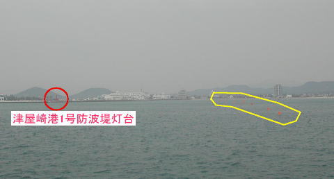南東側には灯浮標があり、その南側には網が設置されている |