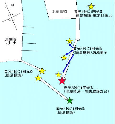 ![]() 津屋崎付近海域 航行安全上の留意事項 ○入出港の際、津屋崎港一号防波堤灯台側が主港口で、 沖防波堤西側からは水深が浅く通航できないので注意。 ○港前面西側は浅水深なので要注意。 ○水産高校東側の黄色の簡易標識は、栽培漁業の取水管設置を示す。 ○プレジャーボートの入出港が多いので注意。 ○漁港の南東側には灯浮標があり、その南側には網が設置されている。 ○漁港内の一号防波堤付近には浅瀬表示の黄色灯浮標3基が設置されている。 |