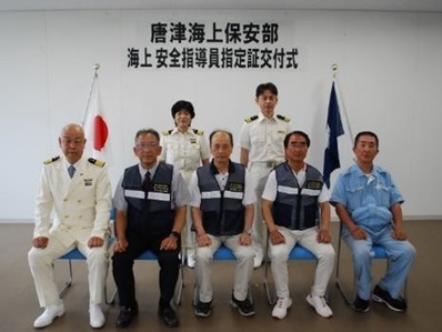 ボランティアで海の安全を守る 海上安全指導員 に新たに3名のパートナーが増えました! 夏のシーズン目前の6月22日、唐津海上保安部長から認定証を交付。 「事故の未然防止に努めたい」と意気込みを胸に、「安心・安全な唐津の海」を目指します! |