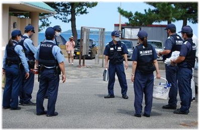 唐津海上保安部では、唐津市、NPO法人唐津湾小型船安全協会(唐津マリン青バイ隊)、唐津警察署と合同で、佐賀県唐津市内の海水浴場にて遊泳中の事故防止等の呼びかけを行いました。 コロナ禍という状況でも連日の猛暑!午前中から海水浴場は遊泳客で賑わいを見せており、海の家は満席状態、暑さも関係なしの開放感の中、準備した啓発グッズを手渡しながら、遊泳中の事故防止のポイントなどの呼びかけに、海水浴客の中には、「ぼく離岸流知ってるよ!」と元気に応えてくれるお子さんや、今から水上オートバイに乗り込もうと準備する威勢の良いお兄様方も「遊泳者には十分気を付けます!」と、安全意識も伺え、事故のない楽しい思い出となるよう願うばかりでした。 |