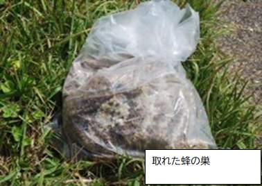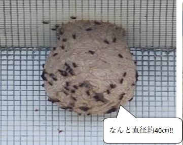 灯台の軒先でブーンブーンと低く唸りを上げるように飛び交っているスズメバチの軍勢と台風の風雨もモノともしない巣の頑丈さに改めて恐さを感じました。 現場に現れたイカツイ顔をしたガタイのいい1人の大男は、県内外のあらゆるスズメバチの巣を駆除してきたと豪語する駆除業者の方でした。 左手には金色に輝く長さ5メートルほどの槍のような駆除専用?の棒と防護服を装備し駆除作業が開始されました。 作業はワイルドに叩き落すという方法で、巣は完全に撤去、戻りバチ対策の薬剤も散布し、20分程で無事作業が完了しました。 直径約40センチ程の巣には1000匹ほどの蜂がいたそうです。 |