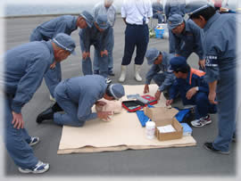 三池海上保安部と合同で、基本的な救助技術の習得と向上を図るために必要な訓練を行っています。(右写真は心肺蘇生法) |