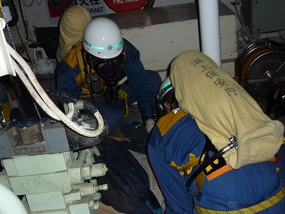 今回は電源喪失で真っ暗な状態の船内に装備した器材でガス検知を行いながら進入し、要救助者を捜索救出するものでした。
