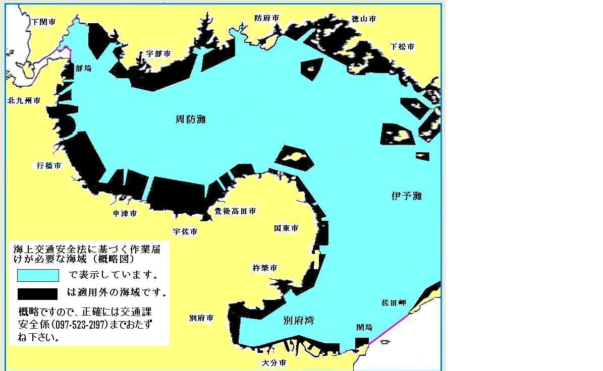 | 海上交通安全法に基づく作業等の届出について 海上交通安全法が適用される海域で工事・作業を行う場合は、届出が必要です。 大分近海で適用される海域は、 関埼灯台と佐田岬灯台を結ぶ線より北側の海域 周防灘、伊予灘、別府湾です。 ただし、次の海域は該当しません。 港則法の海域 港湾法の港湾区域 漁港区域、 漁船以外の船舶が通常航行しない陸岸沿いの海域 |