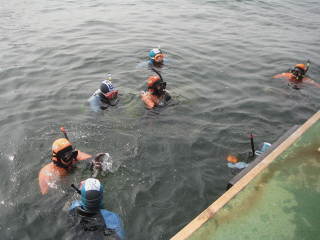 潜水研修はプールでの基礎的な潜水技術の研修から始まり、大学前面海域での慣海実習、最終的には深度40メートルの海域での実習と段階的に行われ、その他にも潜水に関する座学、潜水資機材の取り扱い修得と筋肉から脳みそまでみっちりと鍛え上げられる研修です。