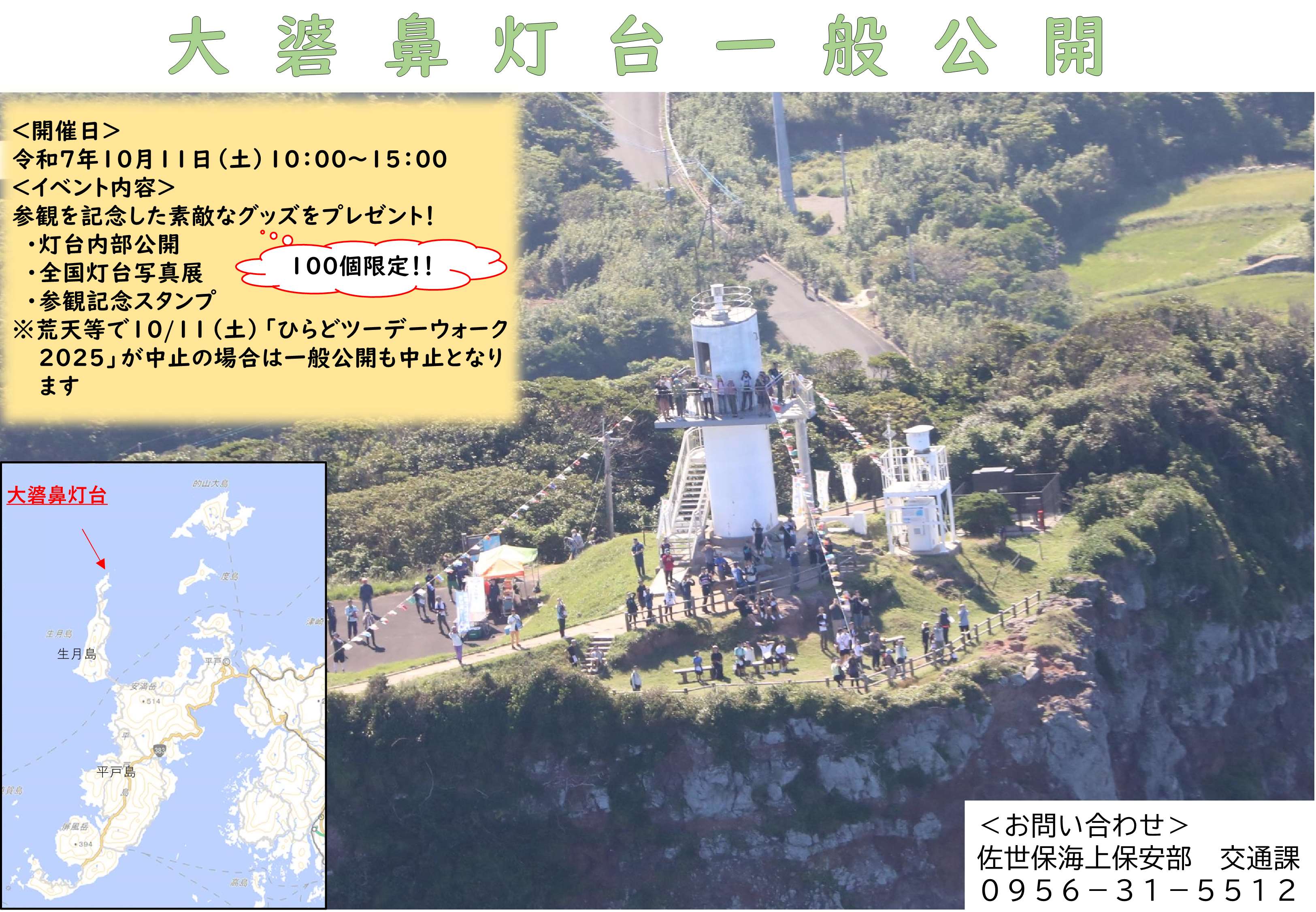 大碆鼻(おおばえはな)灯台の一般公開(10/11) 佐世保海上保安部では、来る10月11日(土)に平戸市生月地区で開催される「ひらどツーデーウォーク2025」の開催にあわせ「大碆鼻灯台」を一般公開します。(公開時間:10月11日(土)10:00~15:00) 先着100名の方に来場記念缶バッジをプレゼントします。 多くの方々のお越しをお待ちしております。 灯台の場所はこちら↓