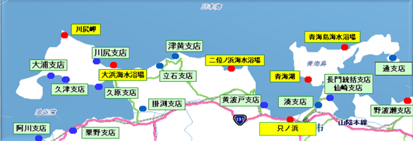 ・仙崎海上保安部では、管内の海難事故を調査するとともに、定置網情報、漁協やマリーナなど海事関係者からヒヤリハット等の情報を入手し、精査してマリンハザードマップを作成しました。 |