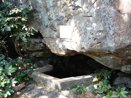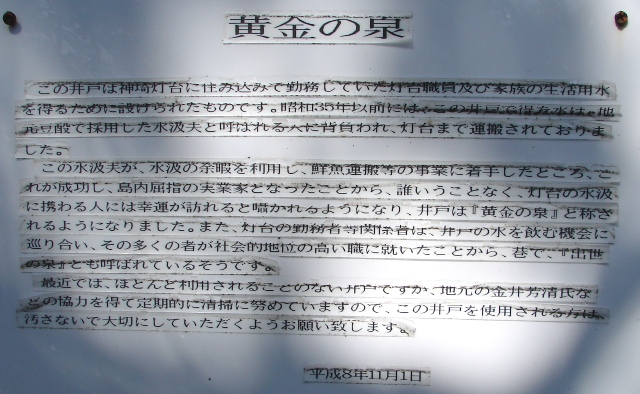 現在「黄金の泉」伝説の元となった「松無井戸」の所在は不明であり、明治33年に神埼灯台付近に設置された神埼灯台水源涵養池である「水溜井」(写真1、2)が、「黄金の泉」と言われています。