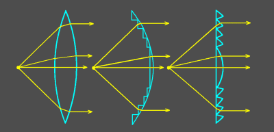 ![]() 一般的な凸レンズ(左端)とフレネルレンズの断面(右端) |