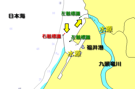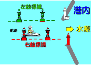 ここで、右舷、左舷標識という場合は、船舶の進行方向によって異なるため基準を定める必要があります。それが「水源」で、港域においては、水源に向かって右が右舷、左が左舷となります。