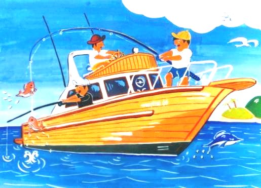 きょうは つりぶねに のって さかなつりです。 てんきも よくて とっても きもちが いいね。 ずっと まえから たのしみに してたんだ。 たくさん つれると いいな。