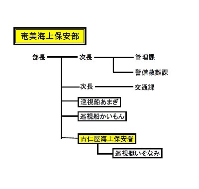 奄美海上保安部には、管理課、警備救難課、交通課と大島郡瀬戸内町周辺海域を管轄する古仁屋海上保安署があります。