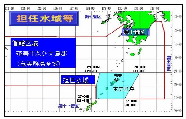 奄美海上保安部は、南九州を管轄区域とする第十管区海上保安本部に属し、奄美市及び大島郡の一市九町二村(奄美群島全域)を含む、南北220km、東西270kmにも及ぶ広大な海域が担任水域(上図参照)となっています。
